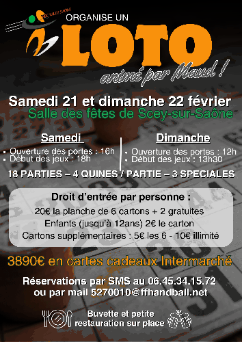 | Du 21/02/2026 au 22/02/2026 à Scey sur Saône et Saint-Albin LOTO DU HBC VAL DE SAONE Le HBC Val De Saône organise son loto les 21 et 22 février 2026. Animé par Maud, les réservations sont ouvertes au 06.45.34.15.72 ou par mail 5270010@gmail.com Buvette et restauration sur place. Le samedi 21/02/26 ouverture des portes 16h, début des jeux 18h Le dimanche 22/02/2026 ouverture des portes 12h, début des jeux 13h30 Tarif : 20¤ droit d'entrée adulte - planche de 6 cartons Tarif enfant 2¤ droit d'entrée enfant - 2¤ le carton Lieu : Salle des fêtes de Scey Sur Saône Email : 5270010@ffhandball.net |