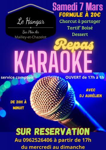 | Le 07/03/2026 à Mailley et Chazelot Repas Karaoké Repas karaoké animé par DJ Aurélien. Menu 20¤ charcuterie, tartif' boisé, dessert Sur réservation au 09 62 52 64 06 Samedi 7 mars, ouverture du bar à 17h, soirée à partir de 20h Lieu : Bar Le Hangar, 19b rue de la fontaine Email : lecamamag@outlook.fr |