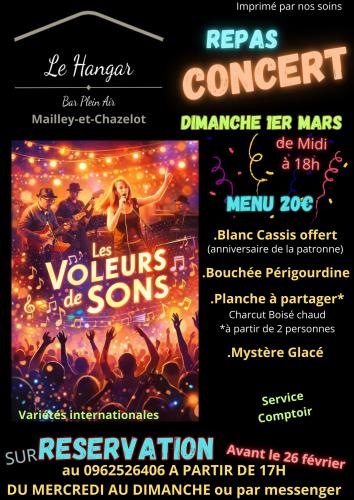 | Le 01/03/2026 à Mailley et Chazelot Repas Concert Repas concert avec Les voleurs de son (variété internationale). Menu 20¤ : bouchée périgourdine, planche à partager (charcuterie, boisé chaud), mystère glacé. Blanc cassis offert Sur réservation au 09 62 52 64 06 avant le 26 février Dimanche 1er mars, de midi à 18h. Lieu : Bar Le Hangar, 19b rue de la fontaine Email : lecamamag@outlook.fr |